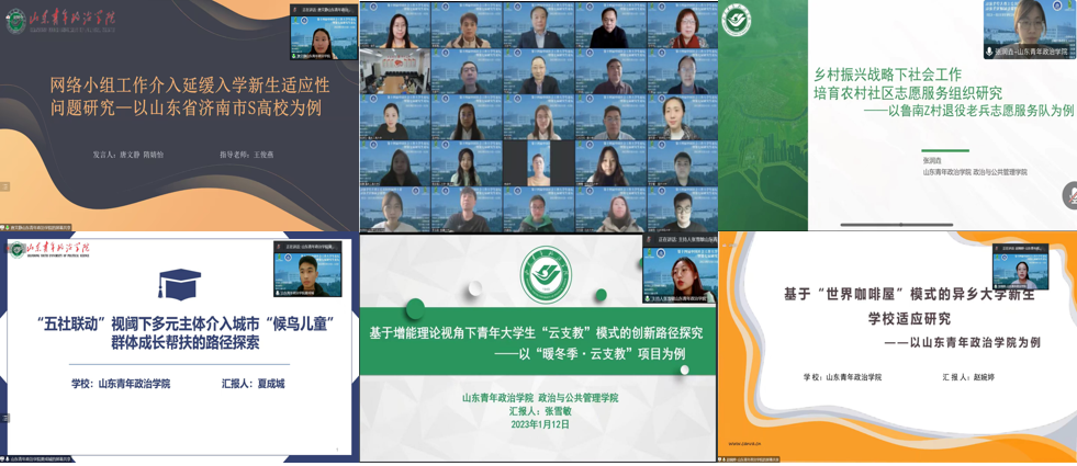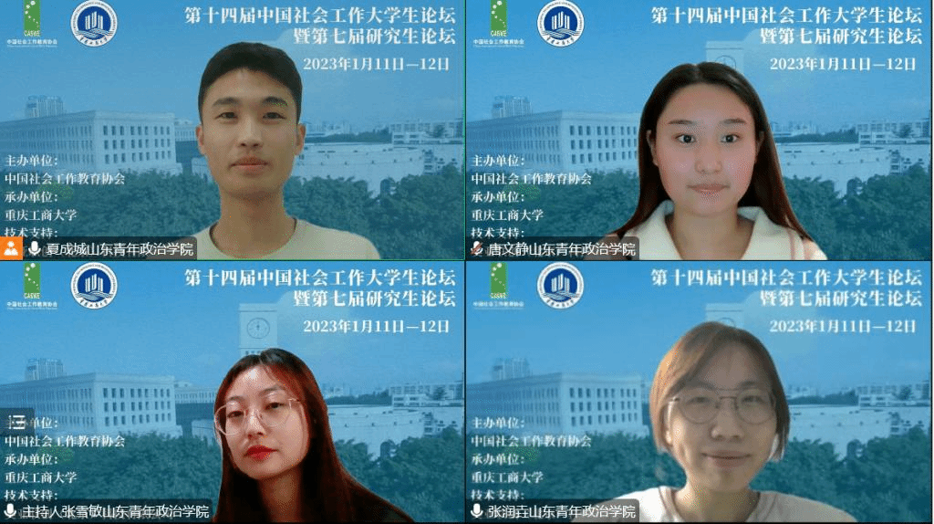 在第十四届中国社会工作大学生论坛中,我校张润垚报送的论文《乡村振兴战略下社会工作培育农村社区志愿服务组织研究——以鲁南 Z 村退役老兵志愿服务队为例》获二等奖(指导教师:孙成键);夏成城报送的论文《“五社联动”视阈下多元主体介入城市“候鸟儿童”群体成长帮扶的路径探索》获三等奖(指导教师:王俊燕、王晓恬);张雪敏报送的论文《基于增能理论视角下青年大学生“云支教”模式的创新路径探究——以“暖冬季·云支教”项目为例》获三等奖(指导教师:秦小峰);唐文静、隋婧怡报送的论文《网络小组工作介入延缓入学新生适应性问题研究——以山东省济南市 S 高校为例》获三等奖(指导教师:王俊燕);赵婉婷、贾筱雨、孔令杰报送的论文《基于“世界咖啡屋”模式的异乡大学新生学校适应研究——以山东青年政治学院为例》获三等奖(指导教师:宋婷)。