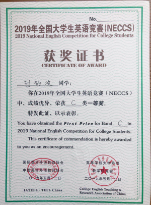 2019年全国大学生英语竞赛(NECCS)山东省赛区决赛如期在山东师范大学举行。我校B类参赛选手英语专业学生闫金成(外国语学院)、C类参赛选手非英语专业学生胡韵波(会计学院)分别荣获一等奖。另外,B类参赛选手英语专业选手吕哲涵等8名同学,C类参赛选手非英语专业选手侯晓辉等14名同学,分获二等奖和三等奖。