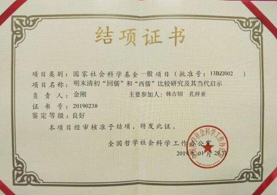 近日,我校金刚教授主持的国家社科基金课题《明末清初“回儒”和“西儒”比较研究及其当代启示》(13BZJ002)通过全国哲学社会科学工作办公室审核,准予结项,鉴定等次为良好。