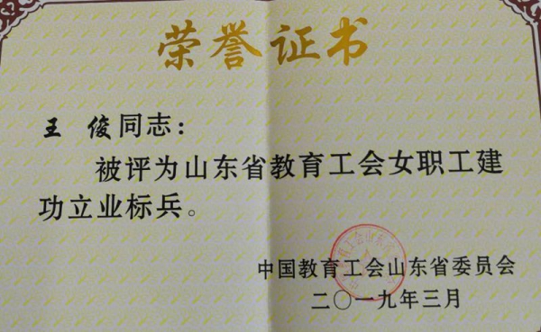 为表彰先进、树立榜样,弘扬劳模精神、劳动精神、工匠精神,进一步激励广大女教职工立足新时代、担当新使命、彰显新作为、展现新风采,近日,山东省教育工会下发《关于公布山东省教育工会先进女职工集体和个人的通知》(鲁教工[2019] 15号)。我校经济管理学院王俊老师被授予“山东省教育工会女职工建功立业标兵”称号。山东省教育工会此次授予64个集体“山东省教育工会女职工建功立业标兵岗”荣誉称号,108名个人“山东省教育工会女职工建功立业标兵”荣誉称号。
