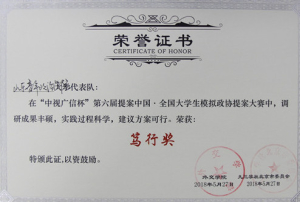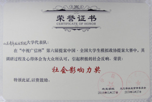 提案中国•全国大学生模拟政协提案大赛系由外交学院和九三学社中央参政议政部联合举办,是一项旨在鼓励大学生深入基层调研,通过调研帮助大学生形成对中国社会准确理性的认识、激发爱国责任感、锻炼大学生实践与分析能力的大型学生活动,迄今已举办六届。本届比赛由外交学院和九三学社北京市委员会主办,复旦大学、南开大学、吉林大学、厦门大学、北京师范大学、中国政法大学、北京外国语大学、中央财经大学、外交学院等26所知名高校的163名学生代表组队参加,我校是唯一参赛的新建本科院校。