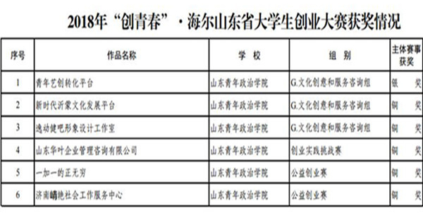 日前,由团省委、省教育厅、省人社厅、省科技厅、省科协、省学联主办的2018年“创青春”·海尔山东省大学生创业大赛决赛落下帷幕。我校师生经过现场质询、个别问辩等环节角逐,从全省76所高校5800件作品中脱颖而出,荣获银奖1项、铜奖5项,团委杜兴东荣获“优秀指导教师”称号,学校首获“优秀组织奖”,取得参加该项赛事的历史性突破。