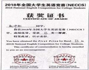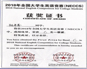 日前,2018年全国大学生英语竞赛(NECCS)山东省赛区决赛在山东师范大学举行。我校C类参赛选手非英语专业学生骆君晟(现代服务学院)、B类参赛选手英语专业学生赵沛然(外国语学院)分别荣获一等奖。B类参赛选手英语专业选手王云霞等8名同学,C类参赛选手非英语专业选手陈雅丽等11名同学,分获二等奖和三等奖。