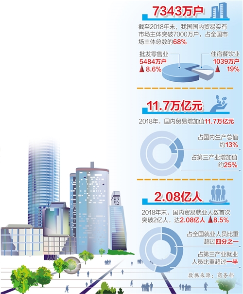 商务部31日发布的数据显示,据初步测算,2018年末国内贸易就业人数达2.08亿人,比上年增长8.5%,首次突破2亿人大关;占全国就业人员比重超过四分之一,占第三产业就业人员比重超过一半。 商务部新闻发言人高峰表示,2018年,国内贸易总体保持平稳较快发展,规模稳步扩大、结构持续优化,为促进经济平稳增长、推动高质量发展、保障和改善民生提供了有力支撑。 一方面,国内贸易在国民经济大产业中的地位进一步巩固。数据显示,2018年,国内贸易主要行业(包括批发零售业,住宿餐饮业,居民服务、修理和其他服务业)实现增加值11.7万亿元,占国内生产总值约13%,占比仅次于制造业,占第三产业增加值约25%。其中,批发零售业增加值8.4万亿元,增长6.2%;住宿餐饮业增加值1.6万亿元,增长6.5%。 另一方面,国内贸易实有市场主体突破7000万户,创业创新活力竞相迸发。2018年末,国内贸易实有市场主体7343万户,比上年增长10%,占全国市场主体总数68%,高居各行业首位。其中,批发零售业市场主体5484万户,增长8.6%;住宿餐饮业市场主体1039万户,增长19%。2018年,国内贸易新设市场主体1412万户,平均每天新设3.9万户。 高峰表示,2019年开始,商务部将积极推动电商平台开展“双品网购节”系列活动,促进网络零售市场品牌消费、品质消费。春节前,商务部推动主要电商平台积极采取措施,让消费者买到安全、实惠、品质有保障的年货,电商销售年货呈现两个特点:电商销售年货的品质在升级;健康、美容、旅游类产品和服务成为新亮点。 根据部分电商平台的统计,传统的食品、服饰、手机通信类的年货保持稳定增长,生鲜水产类销量增幅超过1倍,部分地方特产销量增幅超过300%。多家电商平台提出春节期间不涨价、不变相加价,对蔬菜、水果、肉蛋等品类的年货推出了不同程度的优惠举措。(冯其予) |