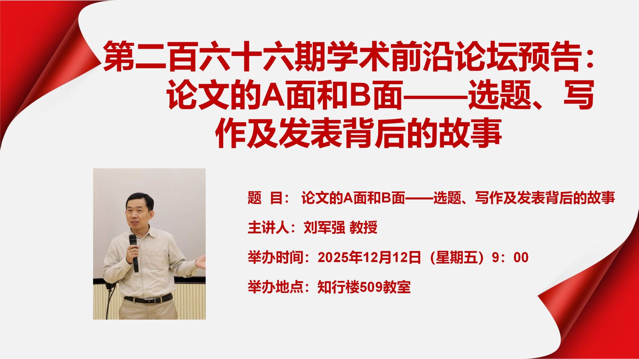 【学术预告】第266期学术前沿论坛预告:论文的A面和B面——选题、写作及发表背后的故事