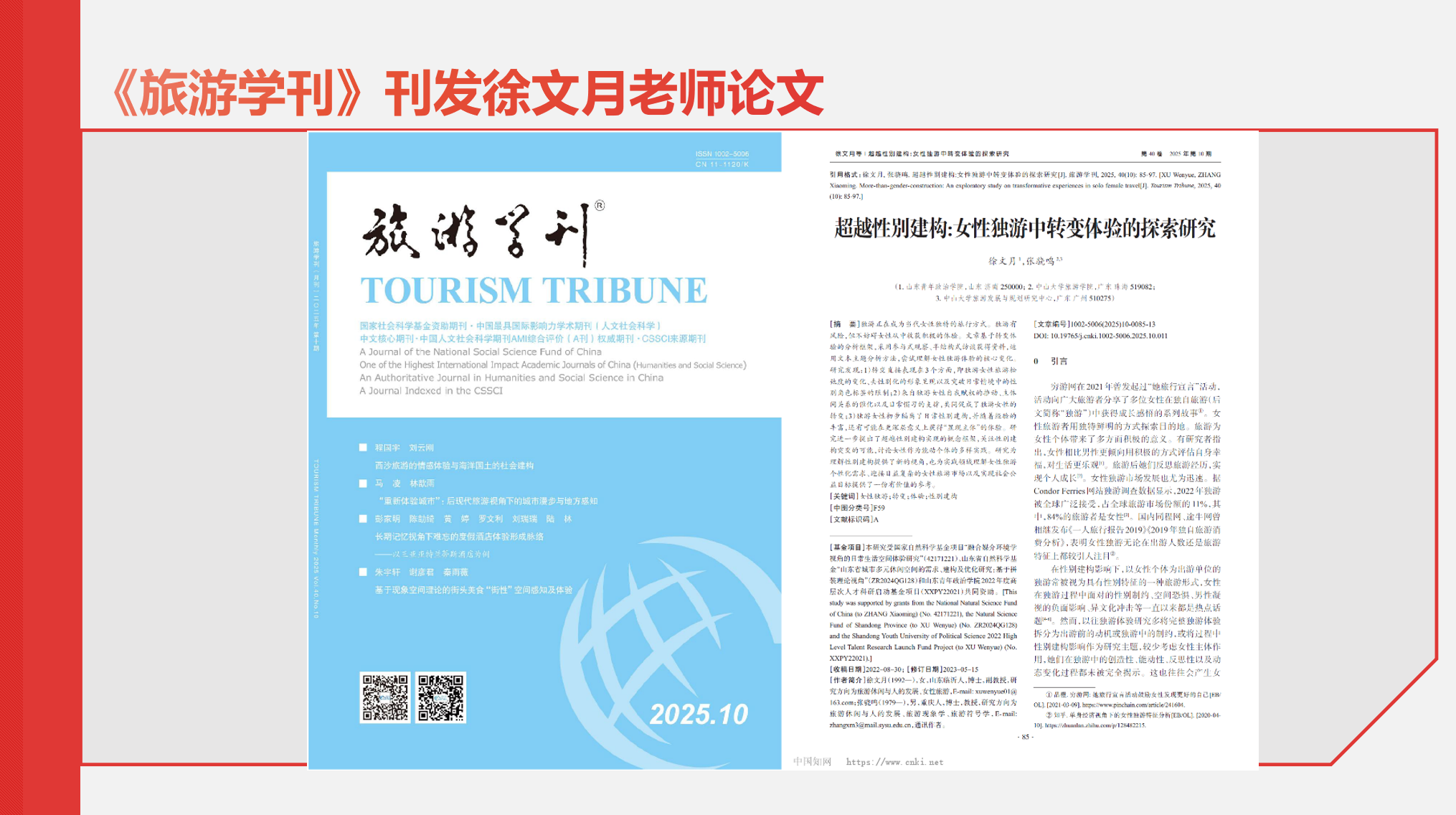 《旅游学刊》(2025年第10期)刊发我校现代服务管理学院教师徐文月的学术论文《超越性别建构:女性独游中转变体验的探索研究》。