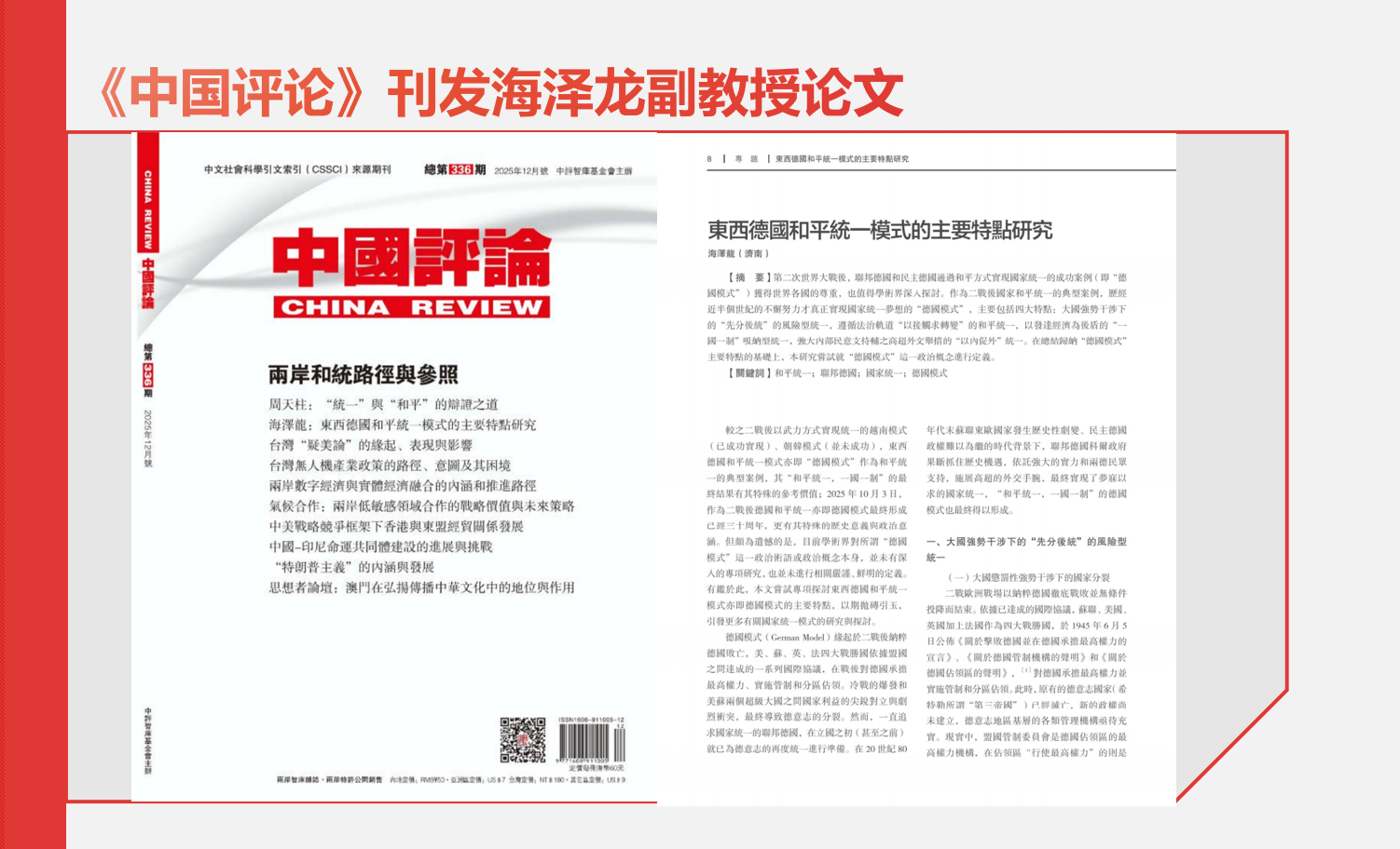 《中国评论》在2025年第12期封面署名刊发了政治与公共管理学院海泽龙副教授的论文《东西德国和平统一模式的主要特点研究》。