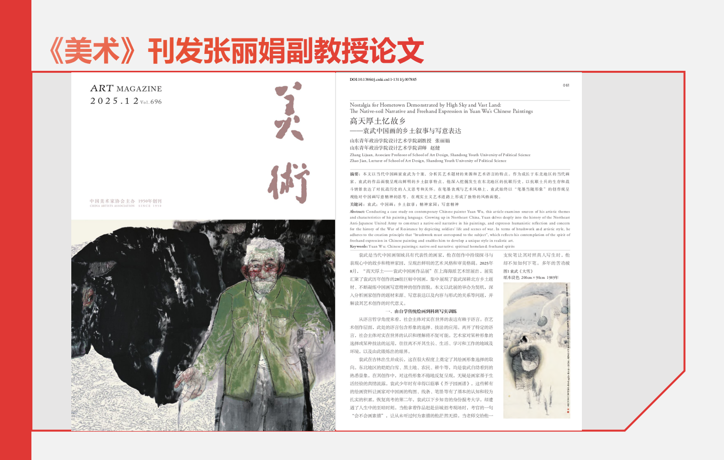 《美术》(2025年第12期)刊发我校设计艺术学院张丽娟副教授学术论文《高天厚土忆故乡——袁武中国画的乡土叙事与写意表达》。