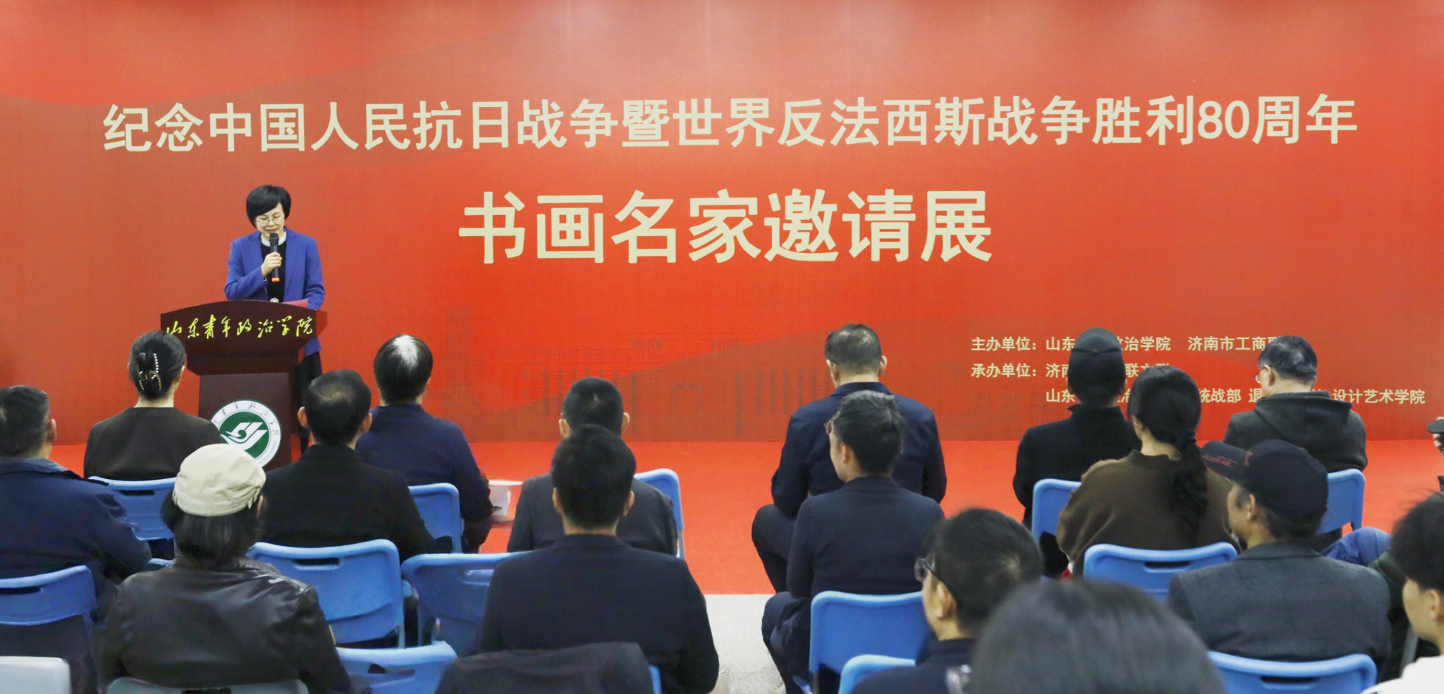 10月23日,由济南市工商联和我校主办,市工商联文联和学校党委统战部、退休工作处、设计艺术学院联合承办的“纪念中国人民抗日战争暨世界反法西斯战争胜利80周年书画名家邀请展”在学校图书馆开幕。济南市委统战部副部长、市工商联党组书记张勇,山东省书法家协会原副主席、顾问李向东,省书协原副主席、顾问郑训佐,市文联副主席、市工商联文联主席万富永等近30位书画名家齐聚山青,以书画铺陈山河,借丹青定格韶华,共同纪念中国人民抗日战争暨世界反法西斯战争胜利80周年。学校党委副书记冯素玲,党委委员、副院长李玉英,党委委员、组织部部长丁萍,党委委员、统战部部长范红伟及学校退休教师、师生代表百余人出席开幕式。