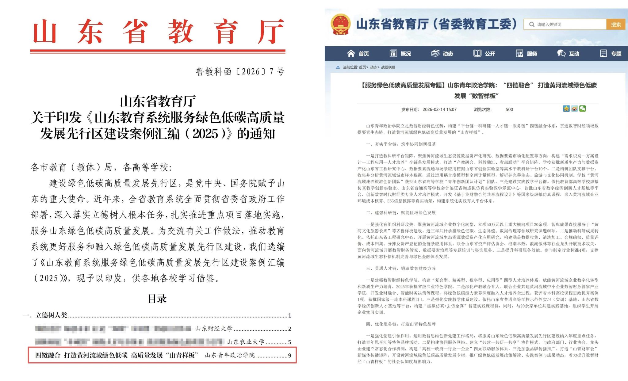 近日,我校《山东青年政治学院:“四链融合”打造黄河流域绿色低碳发展“数智样板”》典型案例,成功入选山东省教育厅印发的《山东教育系统服务绿色低碳高质量发展先行区建设案例汇编(2025)》,并作为10个典型案例之一,获得省教育厅官方网站“战线联播”栏目报道。